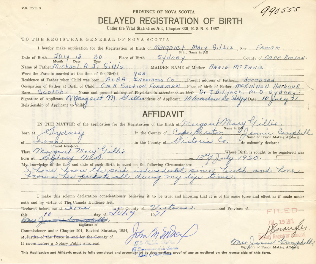 IN THE MATTER of the application for the Registration of the Birth of Margaret MaryGillis