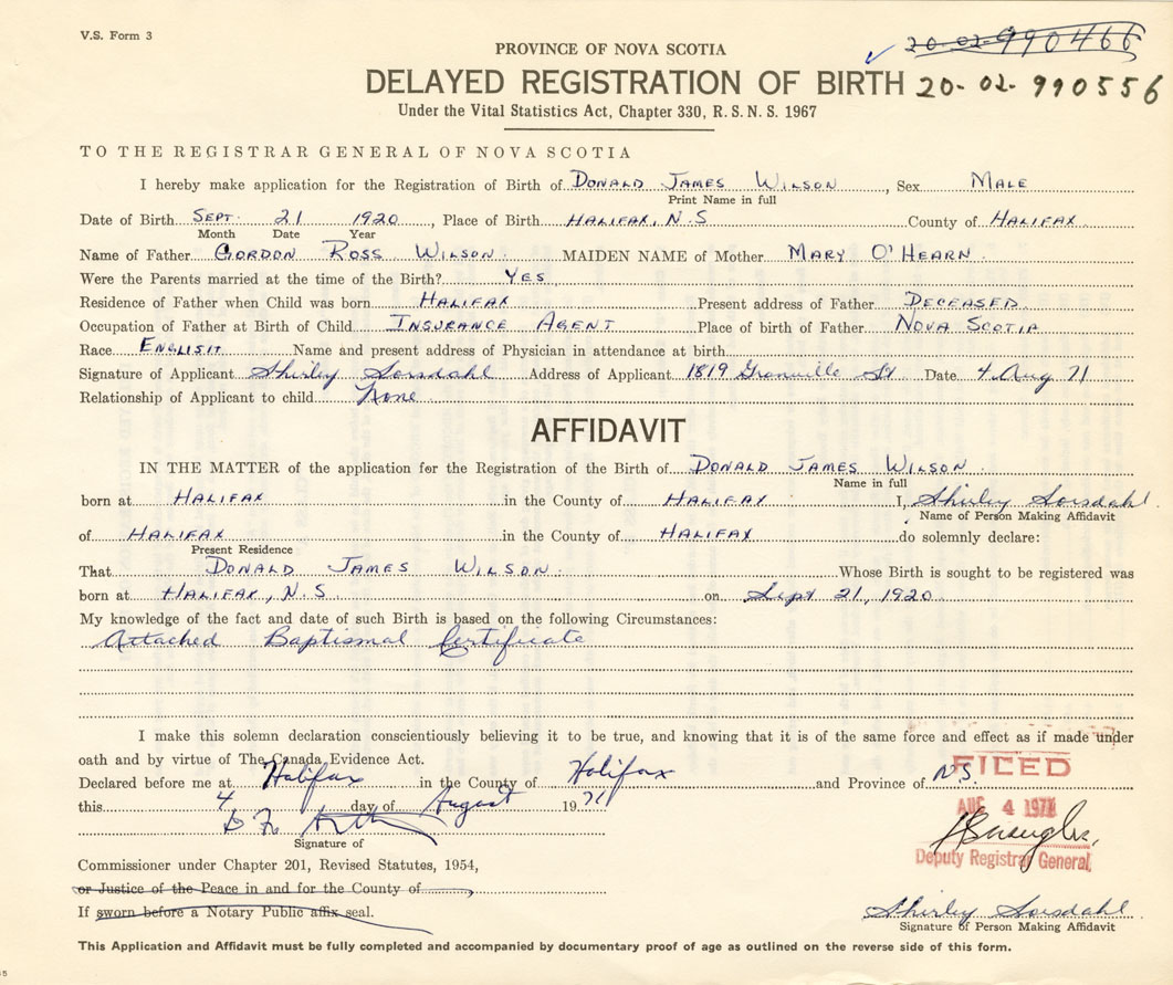 I hereby make application for the Registration of Birth of Donald JamesWilson Sex Male