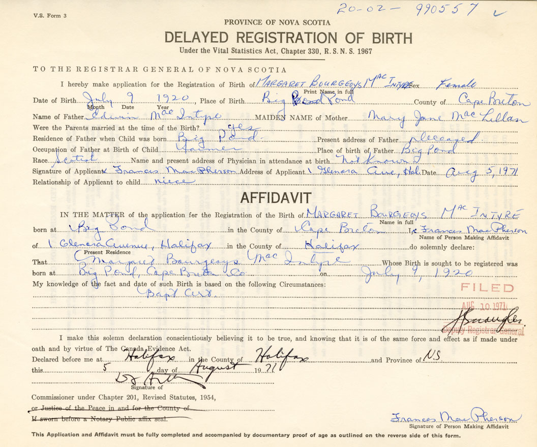 IN THE MATTER of the application for the Registration of the Birth of Margaret BourgeoisMacIntyre