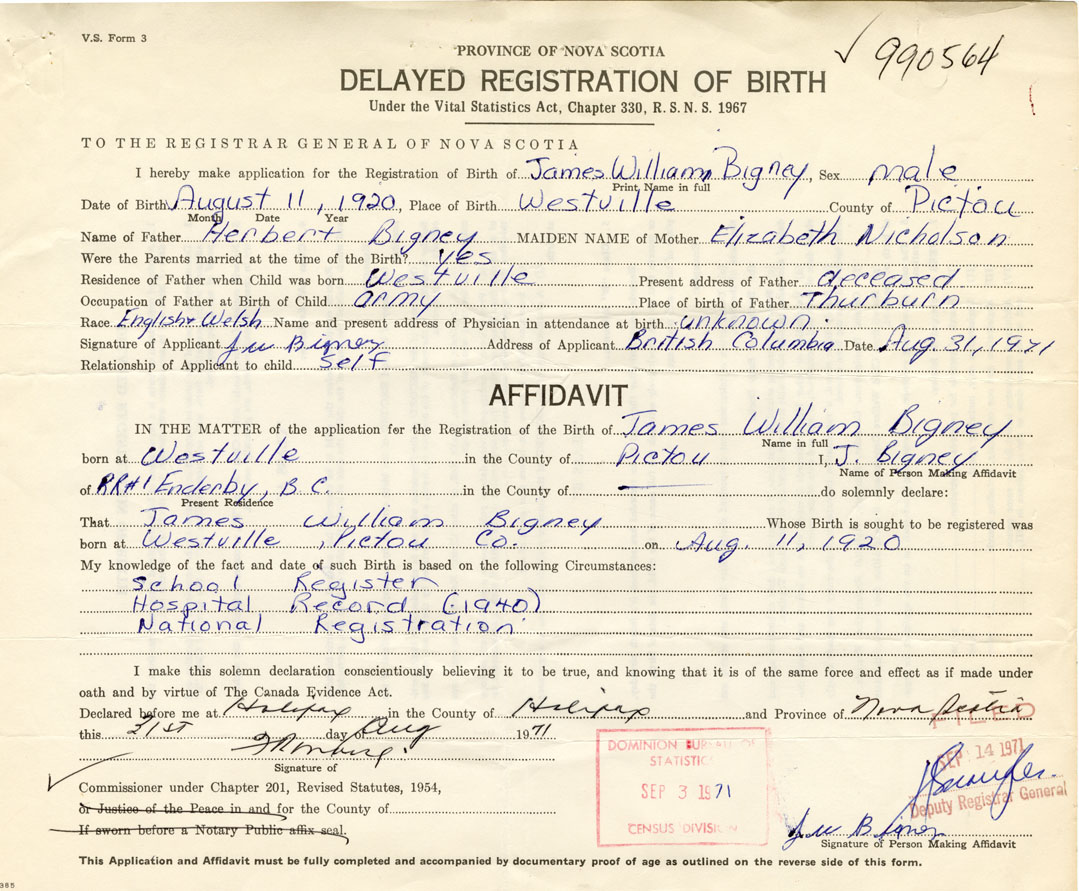 Date of Birth August 11, 1920 Place of Birth WestvilleCounty of Pictou