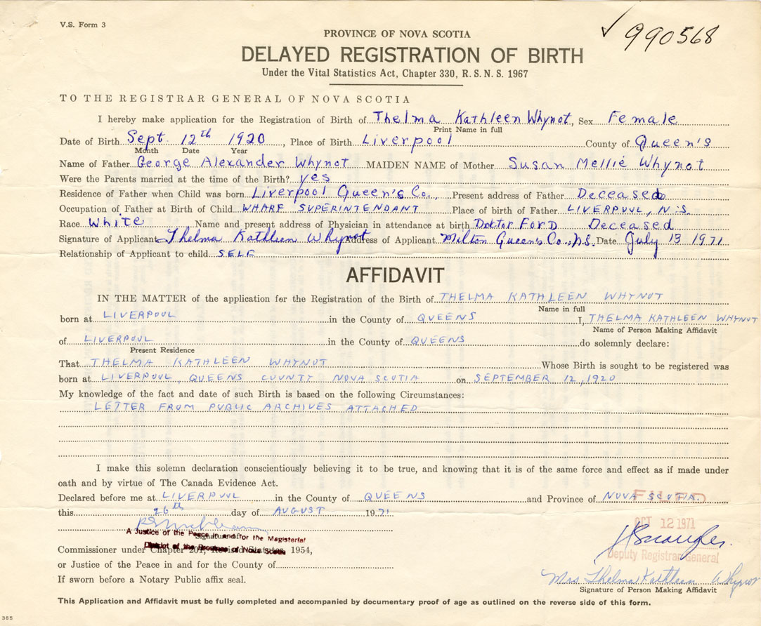 Signature of Applicant Thelma Kathleen Whynot Address of Applicant Milton, Queens County Date July 13, 1971