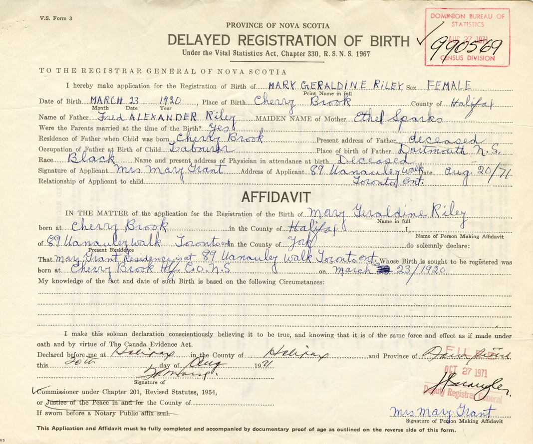 Date of Birth March 23, 1920 Place of Birth Cherry BrookCounty of Halifax