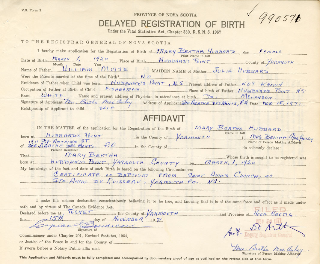 Date of Birth March 1, 1920 Place of Birth Hubbards PointCounty of Yarmouth
