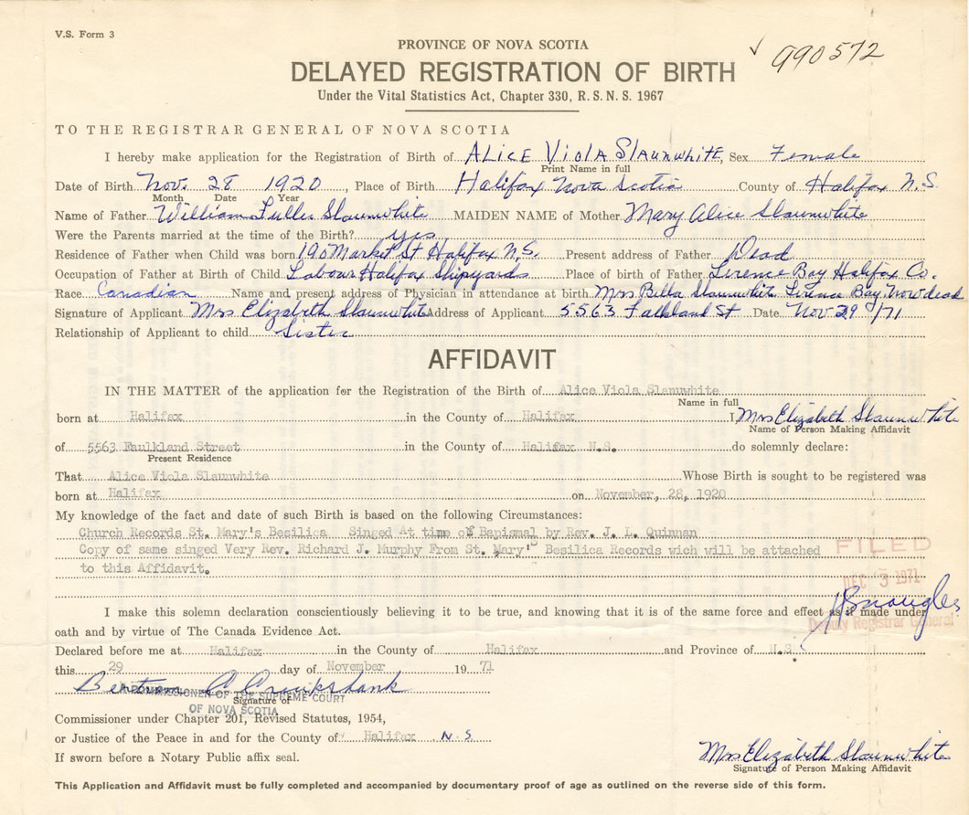 I hereby make application for the Registration of Birth of Alice ViolaSlaunwhite Sex