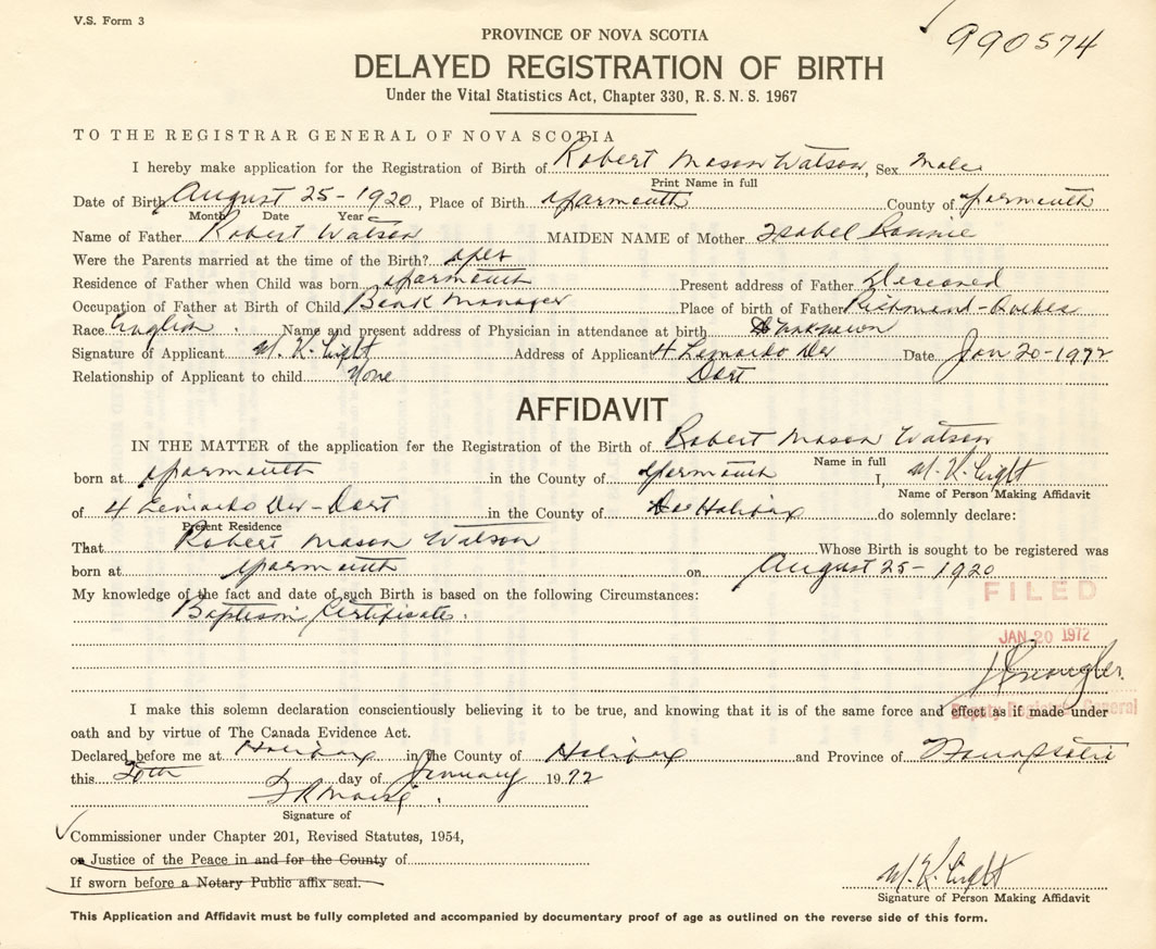 IN THE MATTER of the application for the Registration of the Birth of Robert MasonWatson