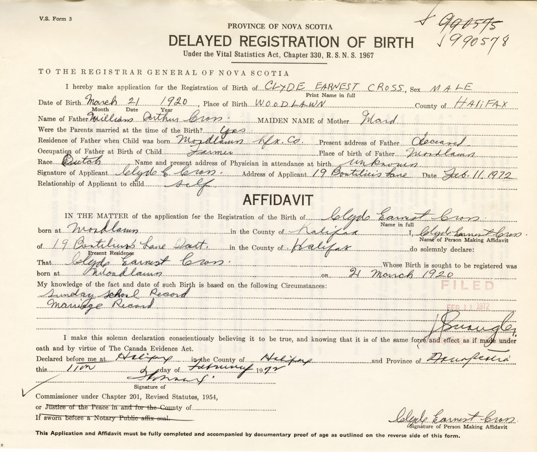 I hereby make application for the Registration of Birth of Clyde ErnestCross Sex