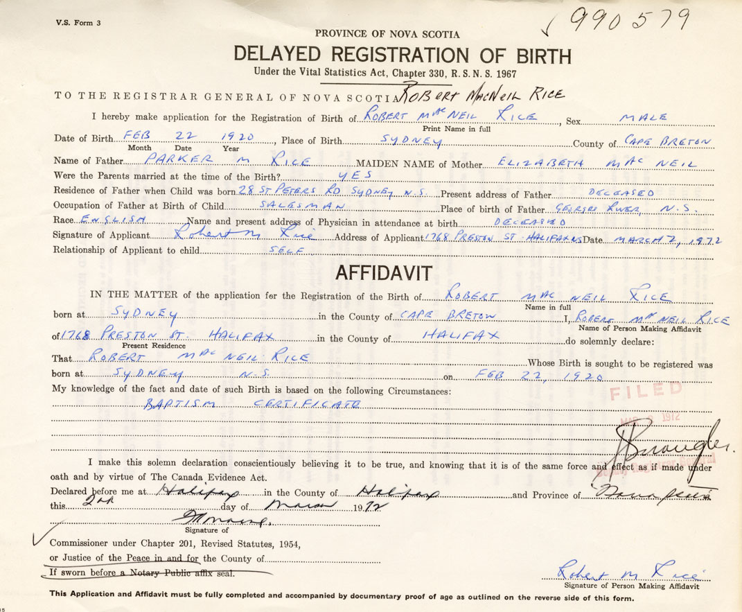 I hereby make application for the Registration of Birth of Robert MacNeilRice Sex