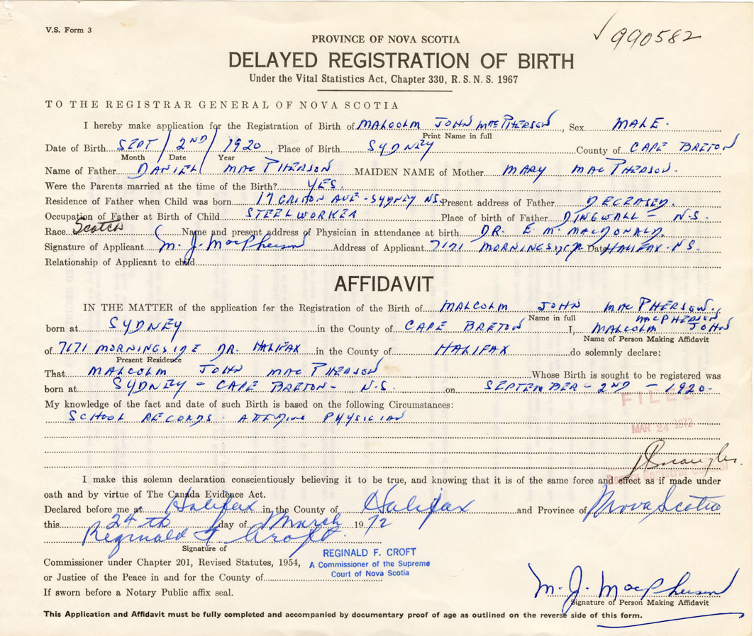 I hereby make application for the Registration of Birth of Malcolm JohnMacPherson Sex Male