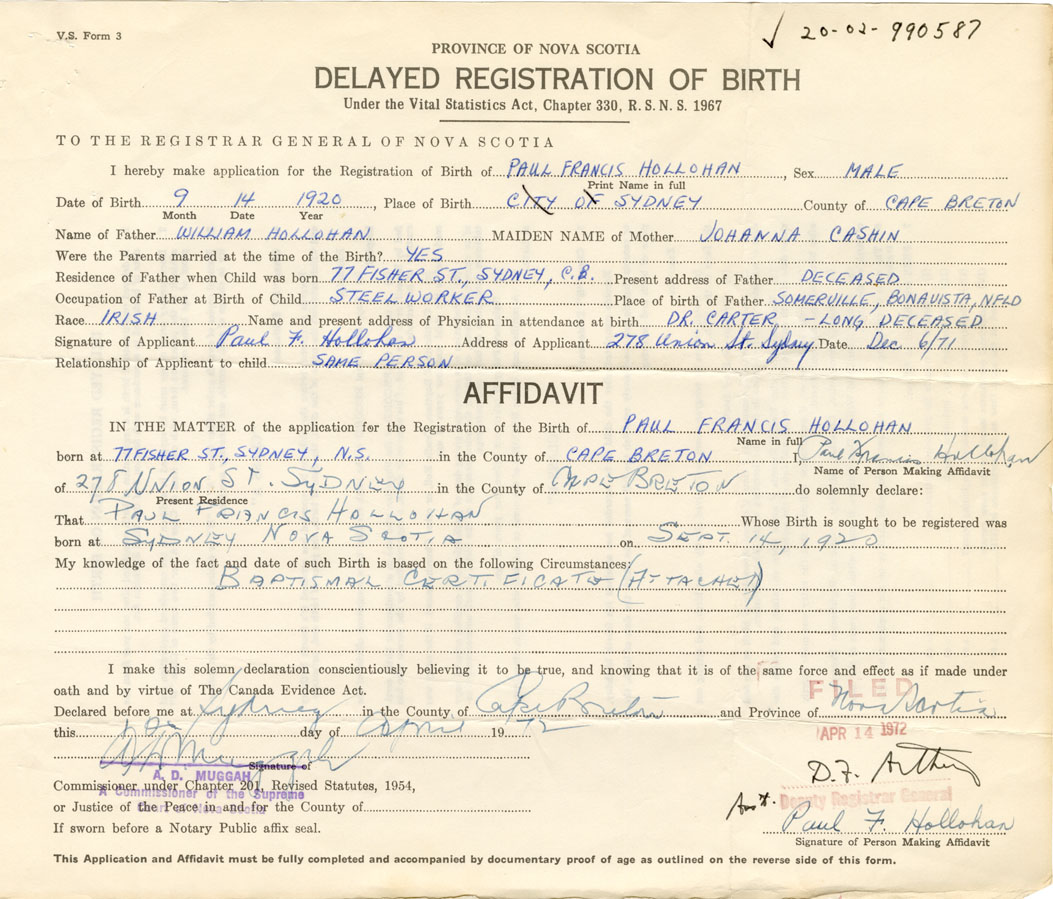 Signature of Applicant Paul F. Hollohan Address of Applicant 278 Union Street, Sydney, Cape Breton Co. Date 6 December 1971
