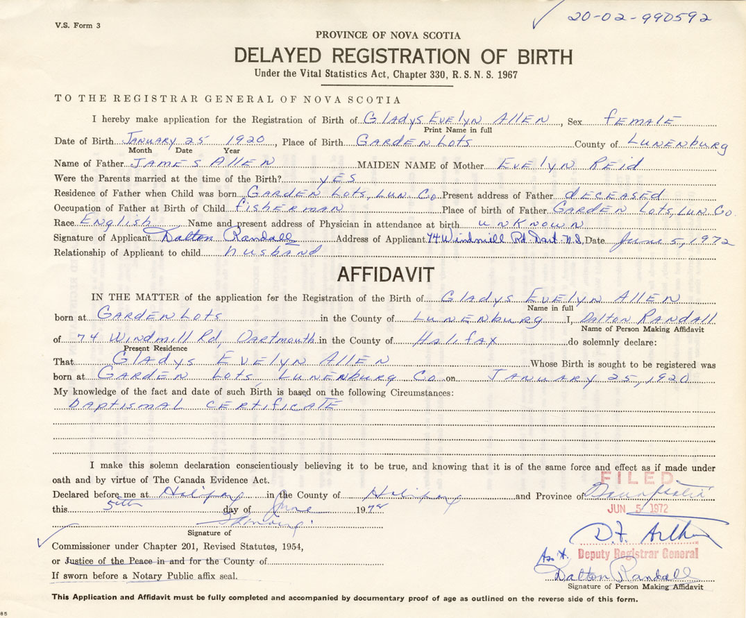 I hereby make application for the Registration of Birth of Gladys EvelynAllen Sex Female