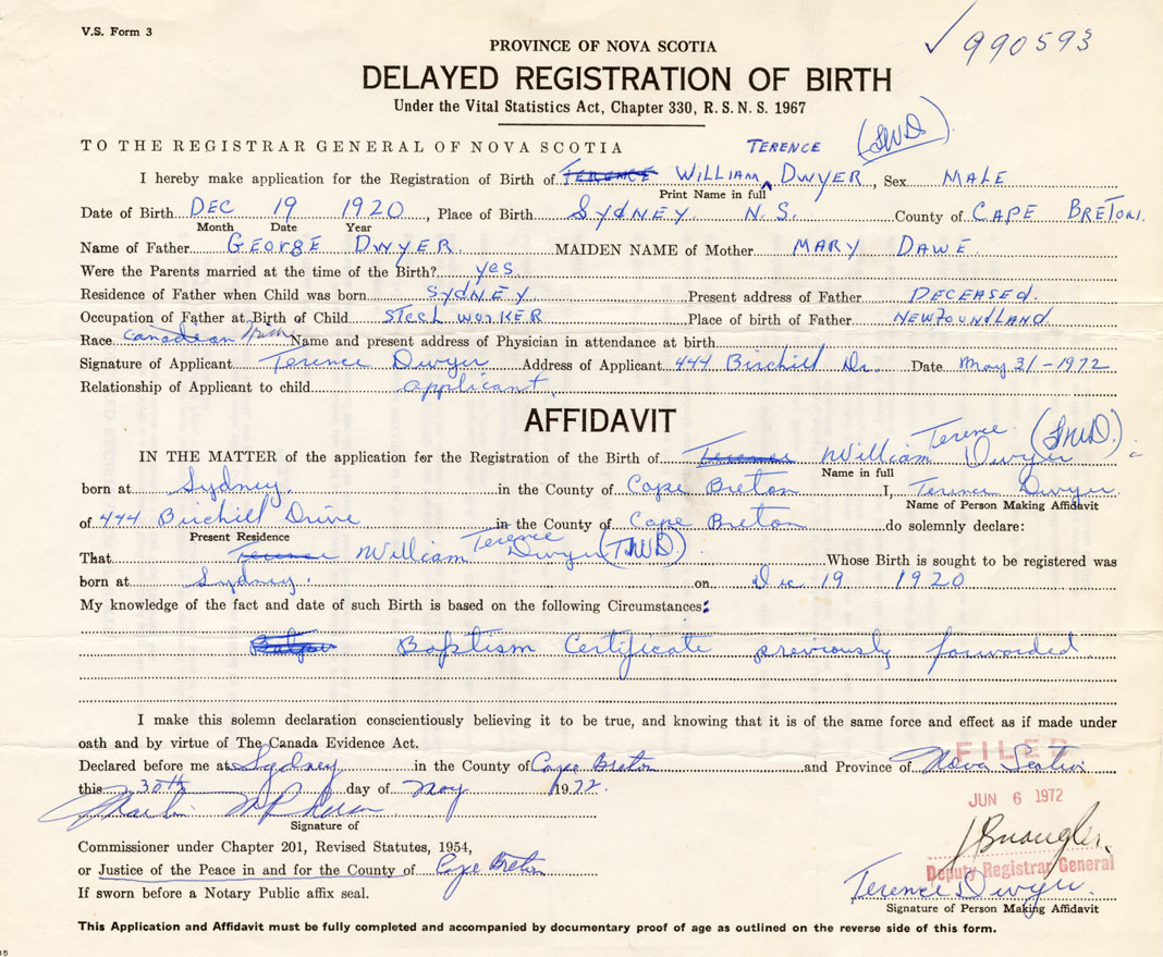 That William TerenceDwyer Whose Birth is sought to be registered was