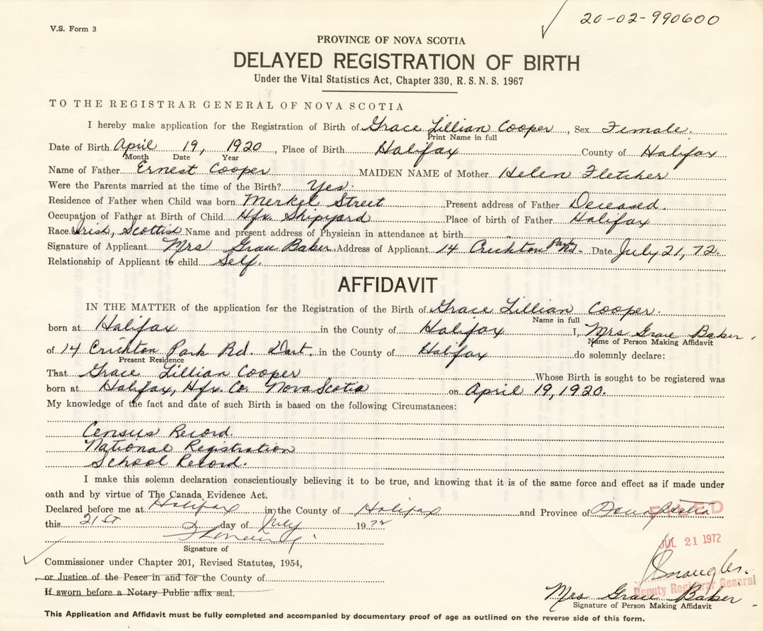 Signature of Applicant Mrs. Grace Baker Address of Applicant 14 Crichton Park Road, Dartmouth Date 21 July 1972