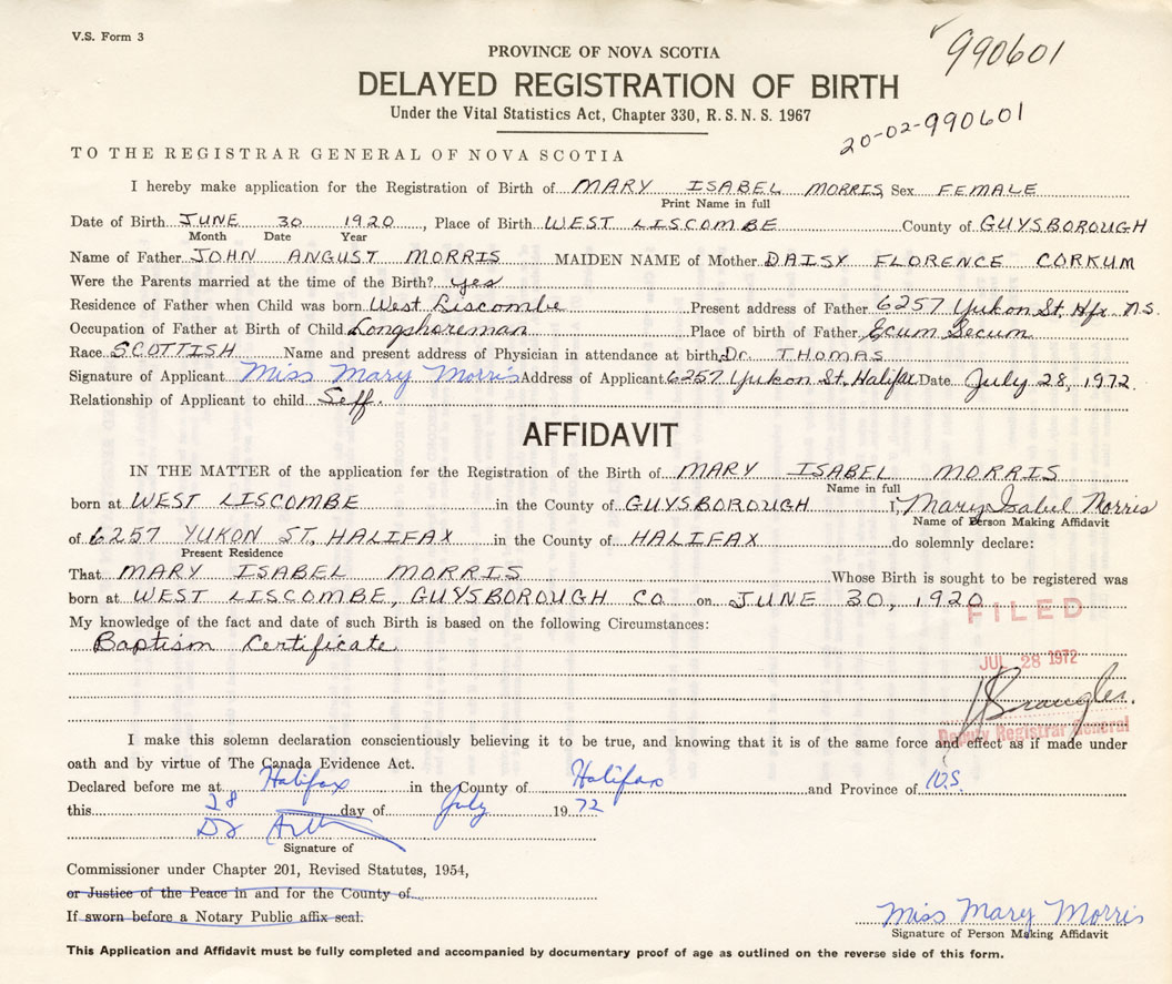 Signature of Applicant Mary Morris Address of Applicant Halifax Date July 28, 11972