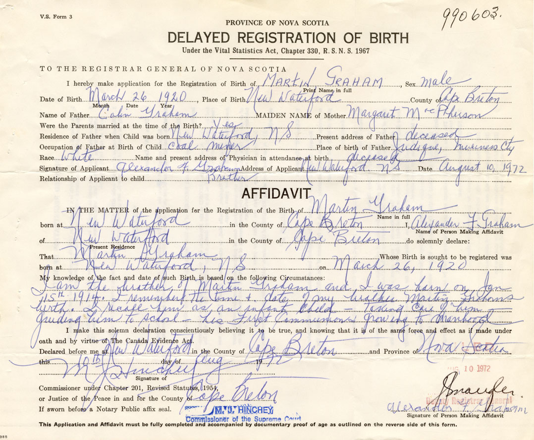 Date of Birth March 26, 1920 Place of Birth New WaterfordCounty of Cape Breton