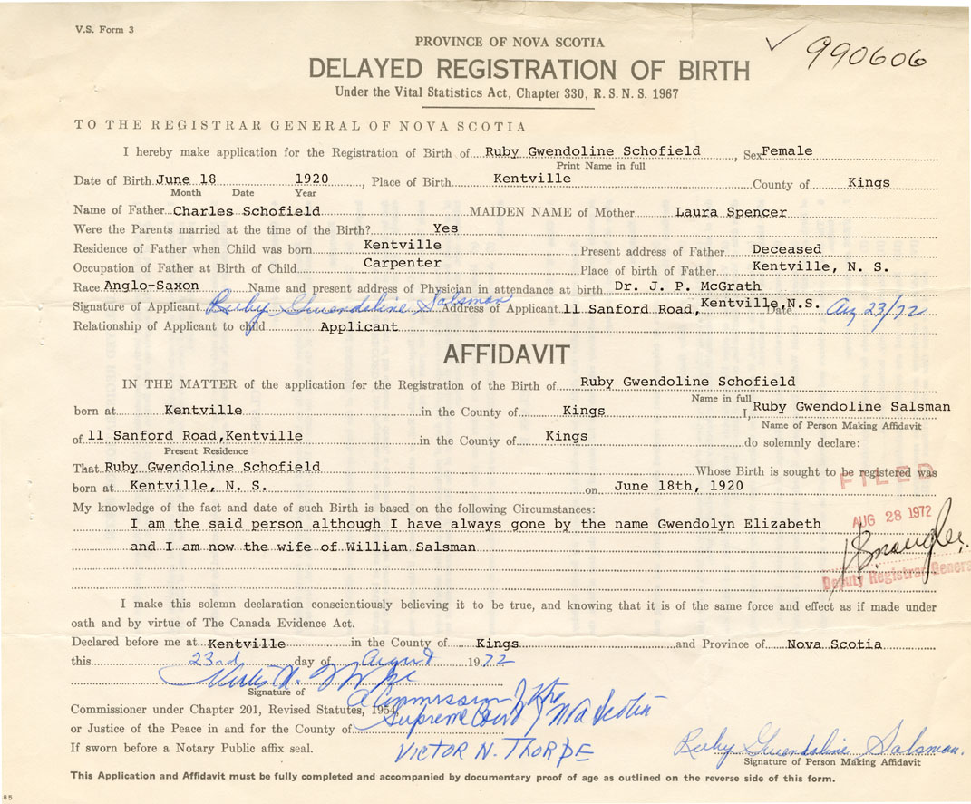 Signature of Applicant Ruby Gwendoline Salsman Address of Applicant Kentville Date August 23, 1972