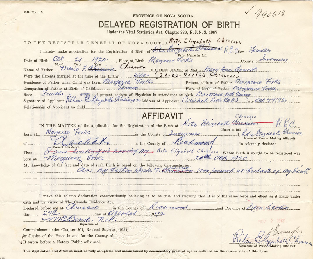I hereby make application for the Registration of Birth of Rita ElizabethChiasson Sex Female