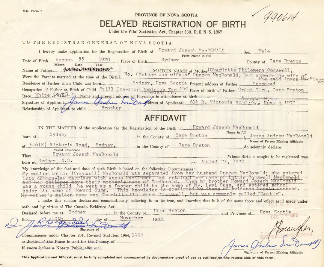 My mother Lottie (Cogswell) MacDonald was separated from her husband, Duncan MacDonald; she entered into common-law marriage with Angus MacKinnon, but retained her name of Lottie Cogswell MacDonald and her children bore their mother's name of MacDonald. When my brother Howard Joseph MacDonald was a young child he went as a foster child to the home of Mr. Levi Sugg, and entered school under the name of Howard Sugg. This knowledge is confirmed by items of evidence hereto annexed. My mother's maiden name was Charlotte Philomena Cogswell, but was commonly called "Lottie".