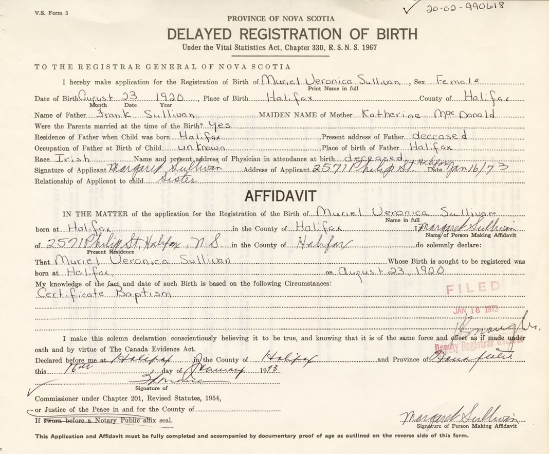 I hereby make application for the Registration of Birth of Muriel VeronicaSullivan Sex Female
