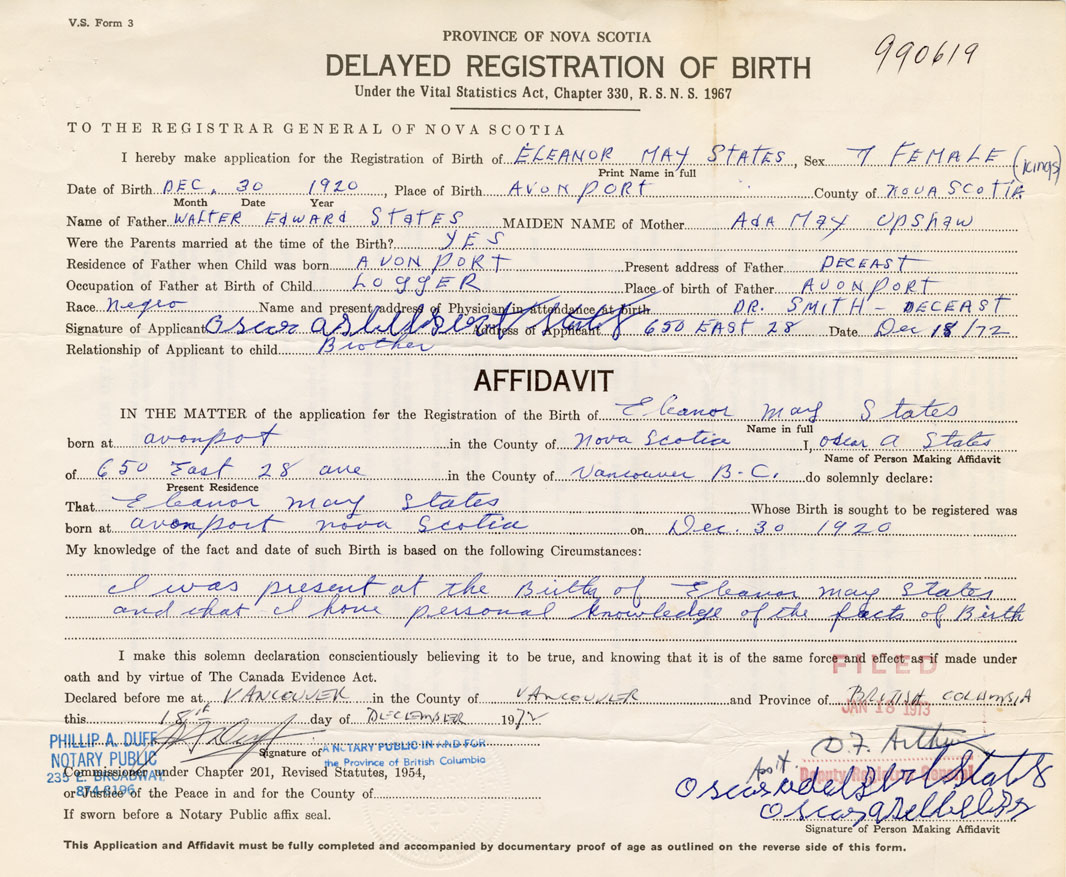 I was present at the birth of Eleanor May States and that I have personal knowledge of the facts of birth.