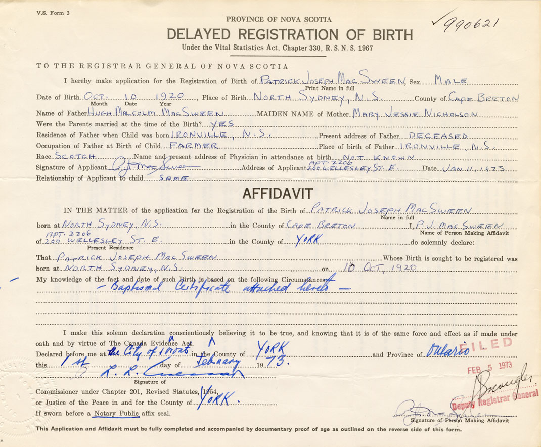 Date of Birth October 10, 1920 Place of Birth North SydneyCounty of Cape Breton