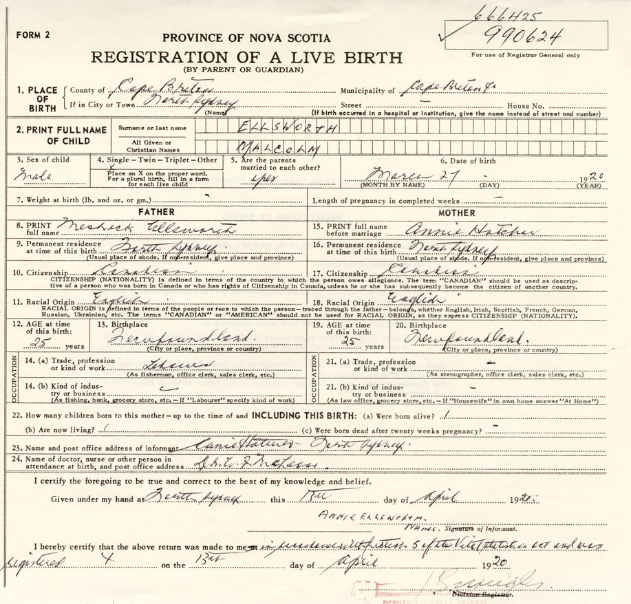 born at North Sydney Cape Breton County on March 27, 1920