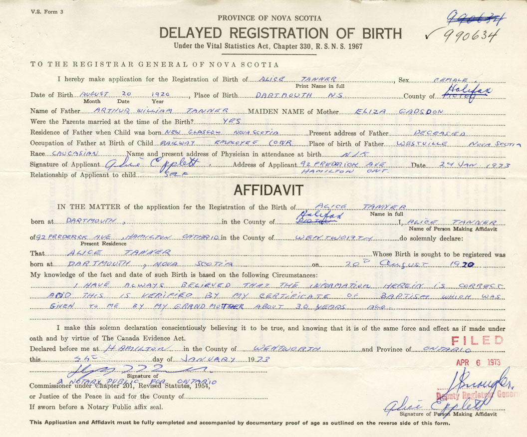IN THE MATTER of the application for the Registration of the Birth of AliceTanner