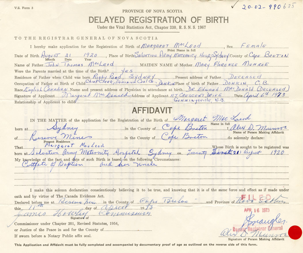 I hereby make application for the Registration of Birth of MargaretMacLeod Sex Female