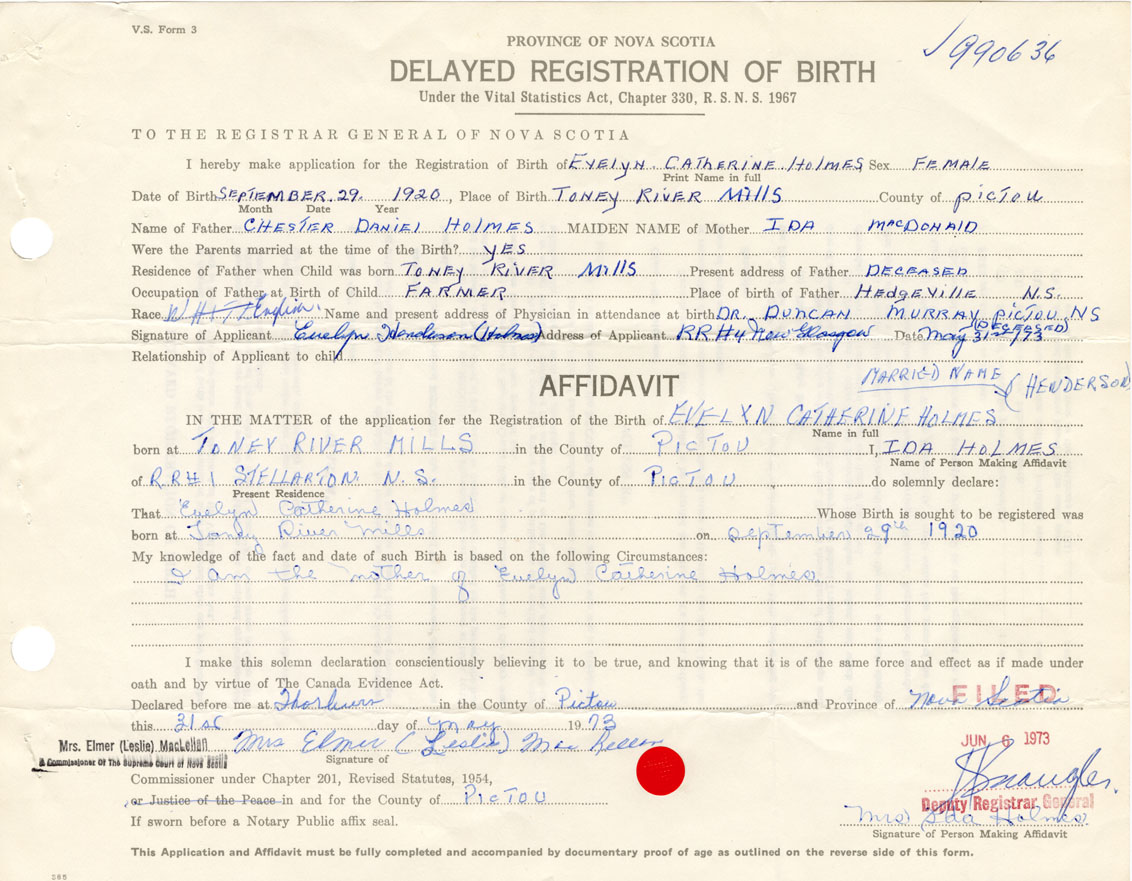 Signature of Applicant Evelyn Henderson Address of Applicant New Glasgow Date May 31, 1973
