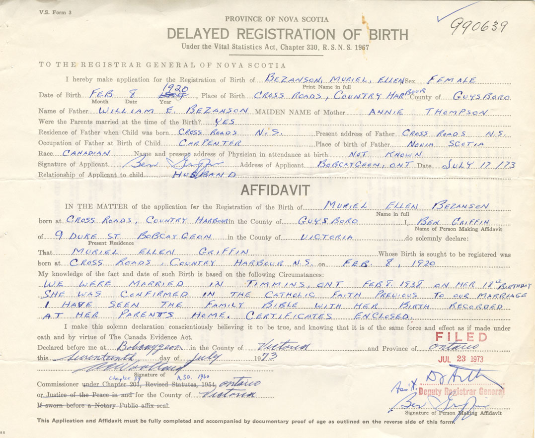 I hereby make application for the Registration of Birth of Muriel EllenBezanson Sex Female