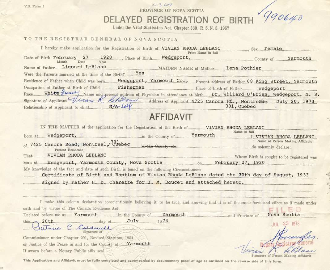 I hereby make application for the Registration of Birth of Vivian RhodaLeBlanc Sex Female