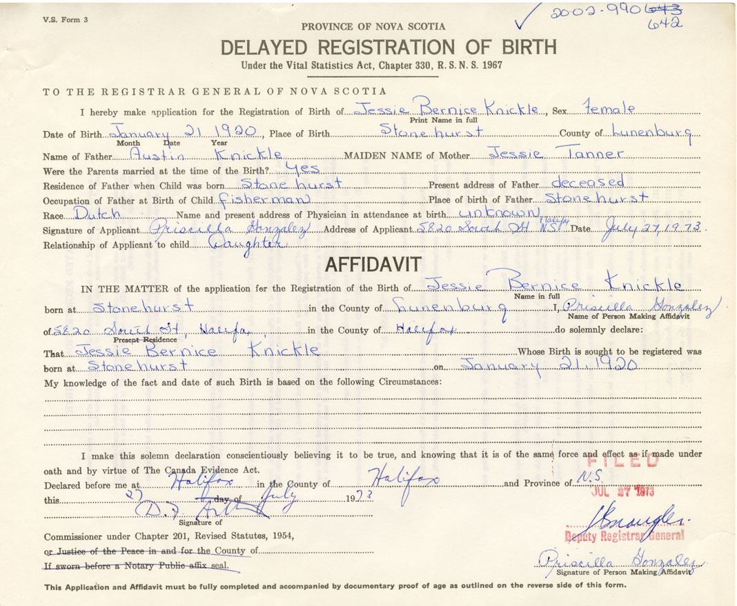 I hereby make application for the Registration of Birth of Jessie BerniceKnickle Sex Female