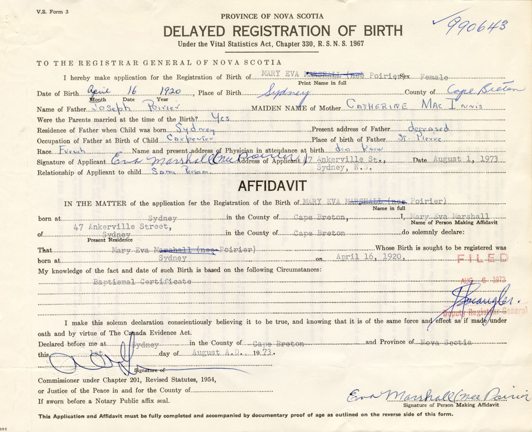 IN THE MATTER of the application for the Registration of the Birth of Mary EvaPoirier