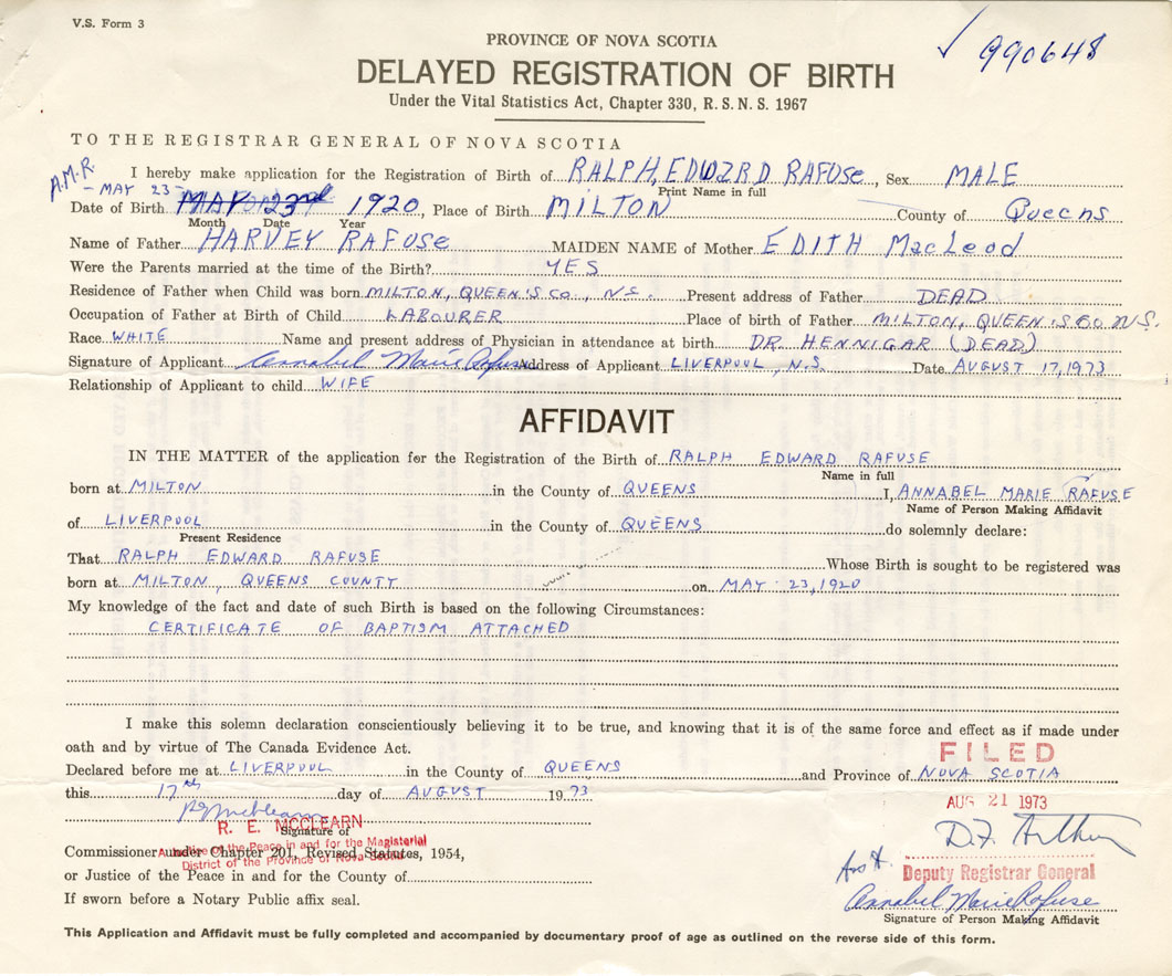 I hereby make application for the Registration of Birth of Ralph EdwardRafuse Sex Male