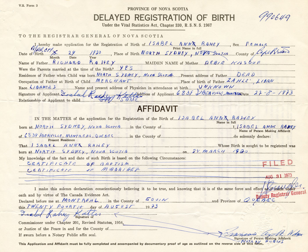 Signature of Applicant Isabel Rahey Katta Address of Applicant Montreal Date August 22, 1973