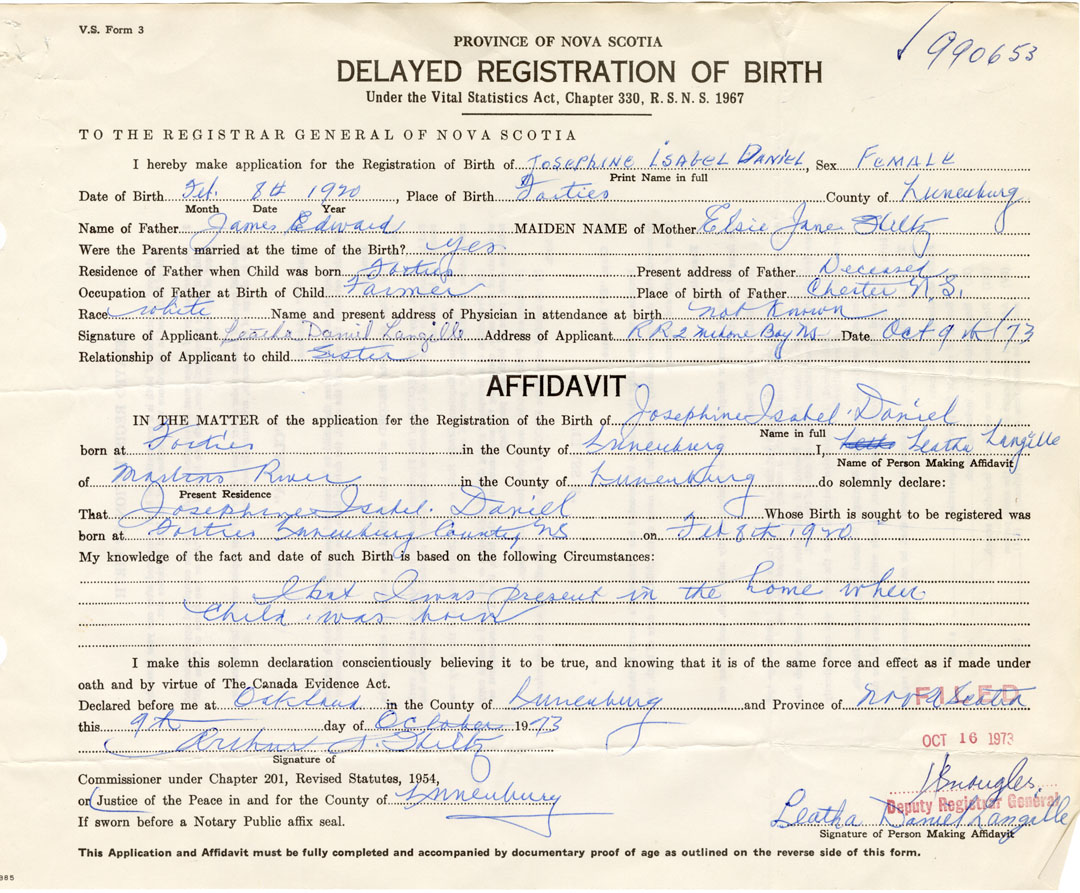 Signature of Applicant Leatha Daniel Langille Address of Applicant R.R. #2, Mahone Bay Date October 9, 1973