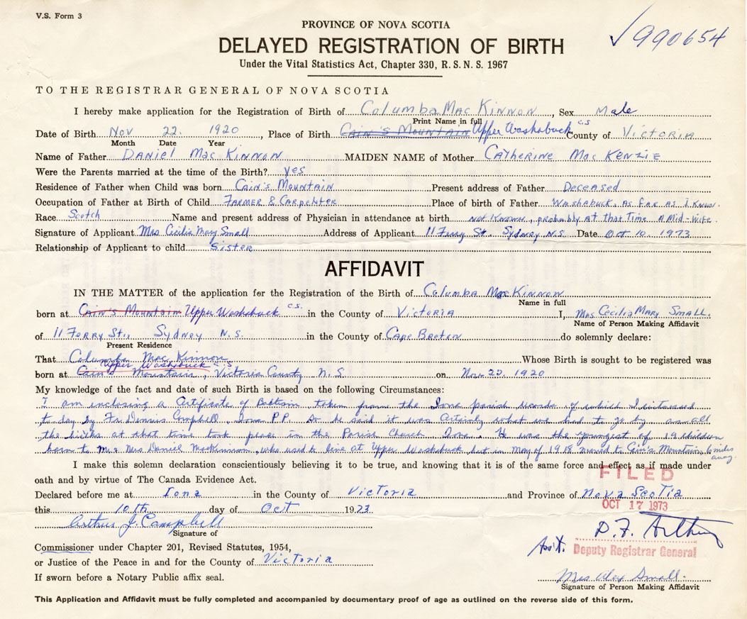I am enclosing a Certificate of Baptism taken from the same parish record of which I was Baptised today by Fr. Dennis Campbell, Iona PP, so he said it was certainly what we had to go by, as all the births as that time took place in the Parish Church. He was the youngest of 19 children born to Mr. & Mrs. Daniel MacKinnon, who used to live at Upper Washabuck, but in May of 1918 moved to Cain's Mountain, 6 miles away.