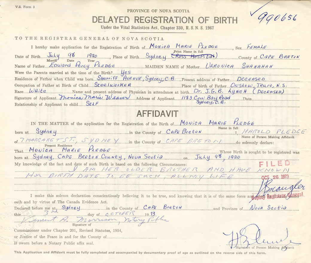 Date of Birth July 9, 1920 Place of Birth SydneyCounty of Cape Breton