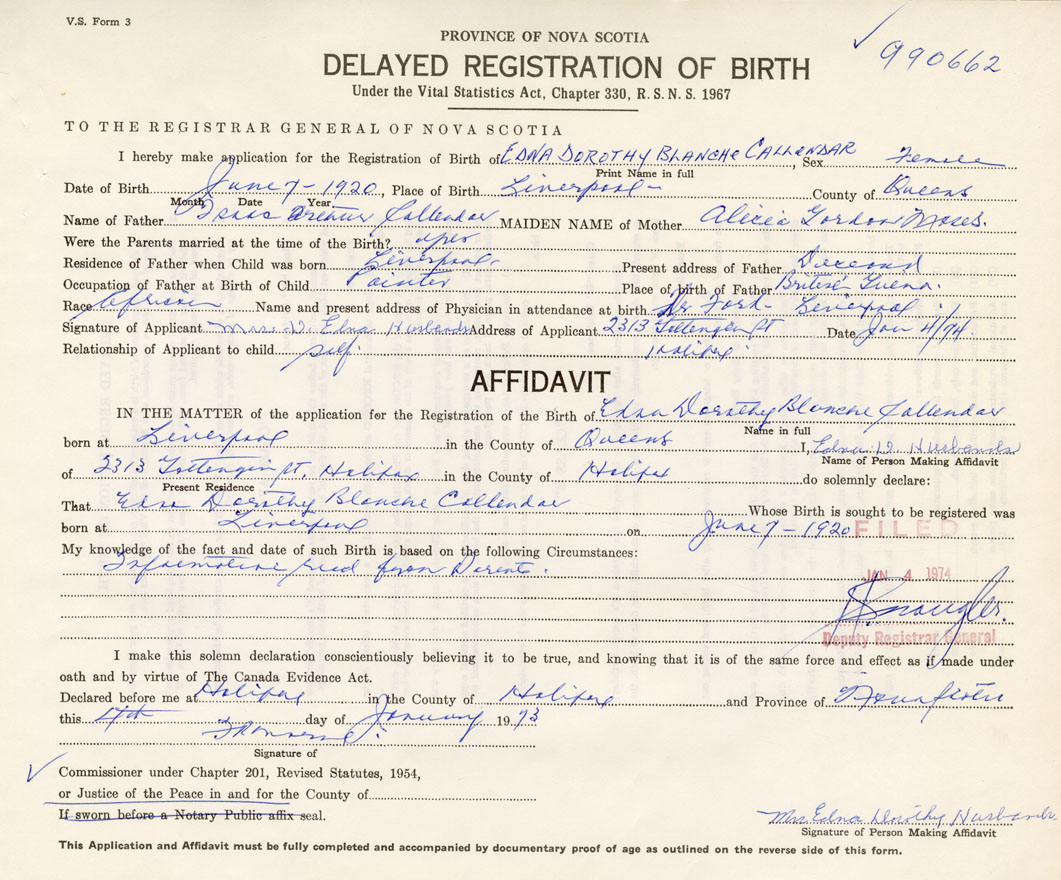 IN THE MATTER of the application for the Registration of the Birth of Edna Dorothy BlancheCallendar