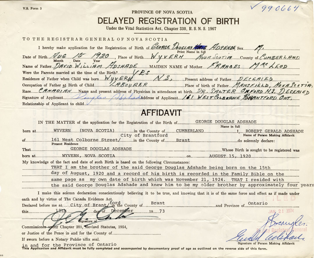 That I am the brother of the said George Douglas Adshade being born on the 15th day of August, 1920 and a record of his birth is recorded in the Family Bible on the same page as my own date of birth which was November 21, 1924. That I resided with the said George Douglas Adshade and knew him to be my older brother by approximately four years. - Robert Gerald Adshade