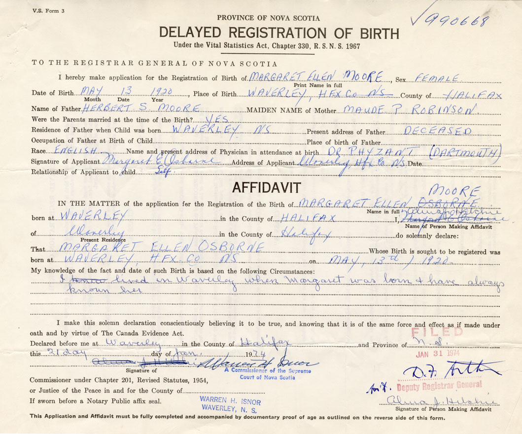 Signature of Applicant Margaret E. Osborne Address of Applicant Halifax Date January 21, 1974