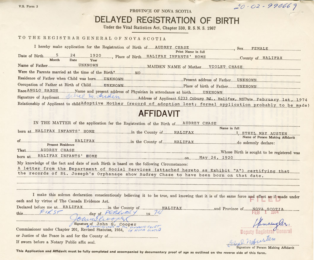 A letter from the department of Social Services (attached hereto as Exhibit "A") certifying that the records of St. Joseph's Orphanage show Audrey Chase to have been born on that date.