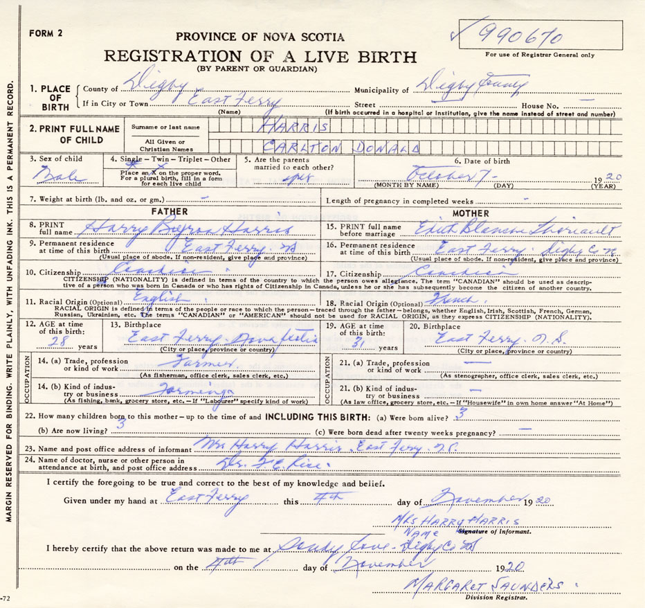 Date of Birth October 7, 1920 Place of Birth East FerryCounty of Digby