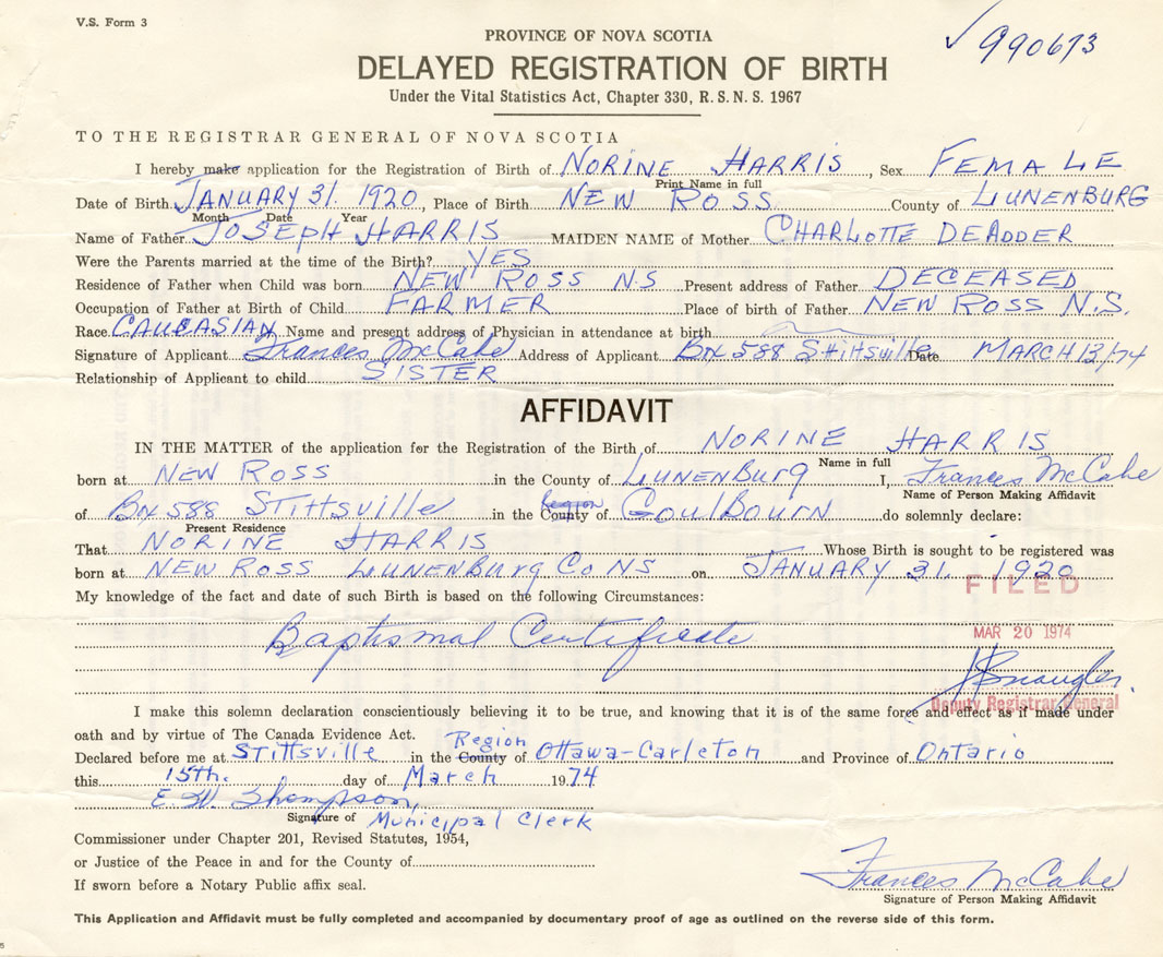 I hereby make application for the Registration of Birth of NorineHarris Sex Female