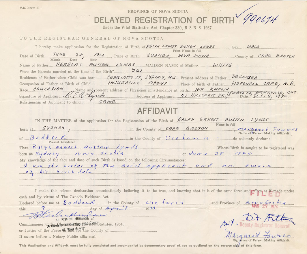 IN THE MATTER of the application for the Registration of the Birth of Ralph Ernest AustenLynds