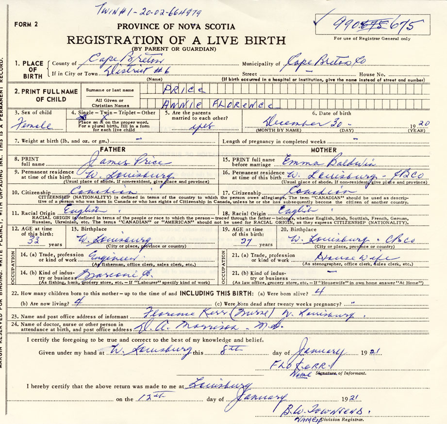 Date of Birth December 30, 1920 Place of Birth West LouisbourgCounty of Cape Breton