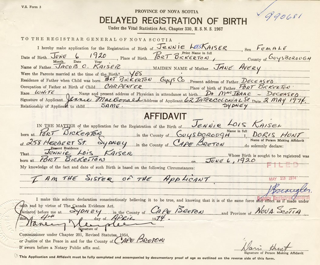 Signature of Applicant Jennie MacDonald Address of Applicant Sydney Date May 2, 1974
