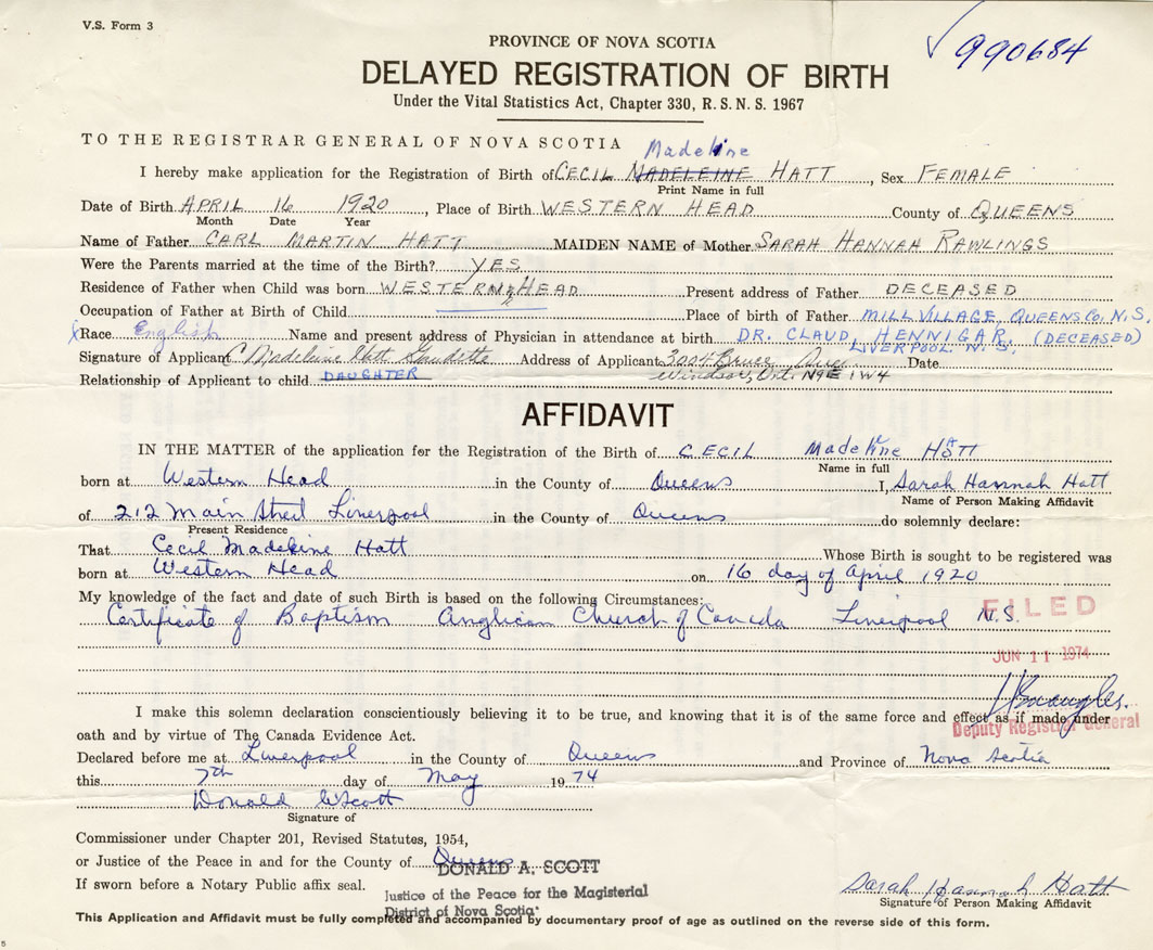 born at Western Head Queens County on April 16, 1920