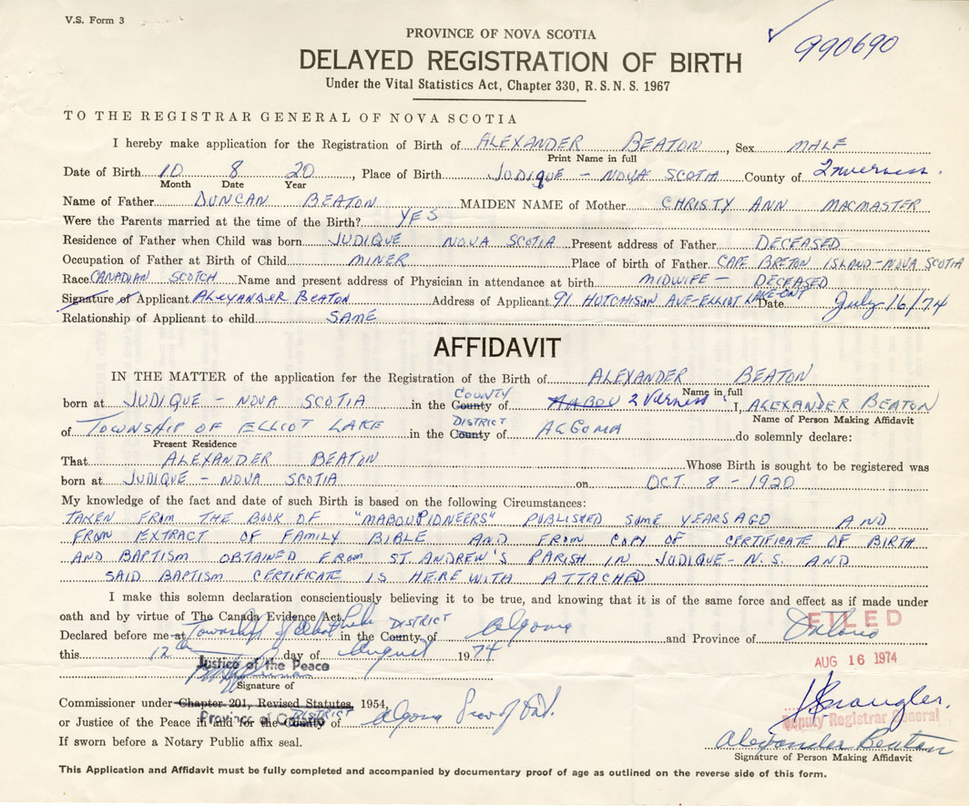 Signature of Applicant Alexander Beaton Address of Applicant Elliot Lake, Ontario Date July 16, 1974