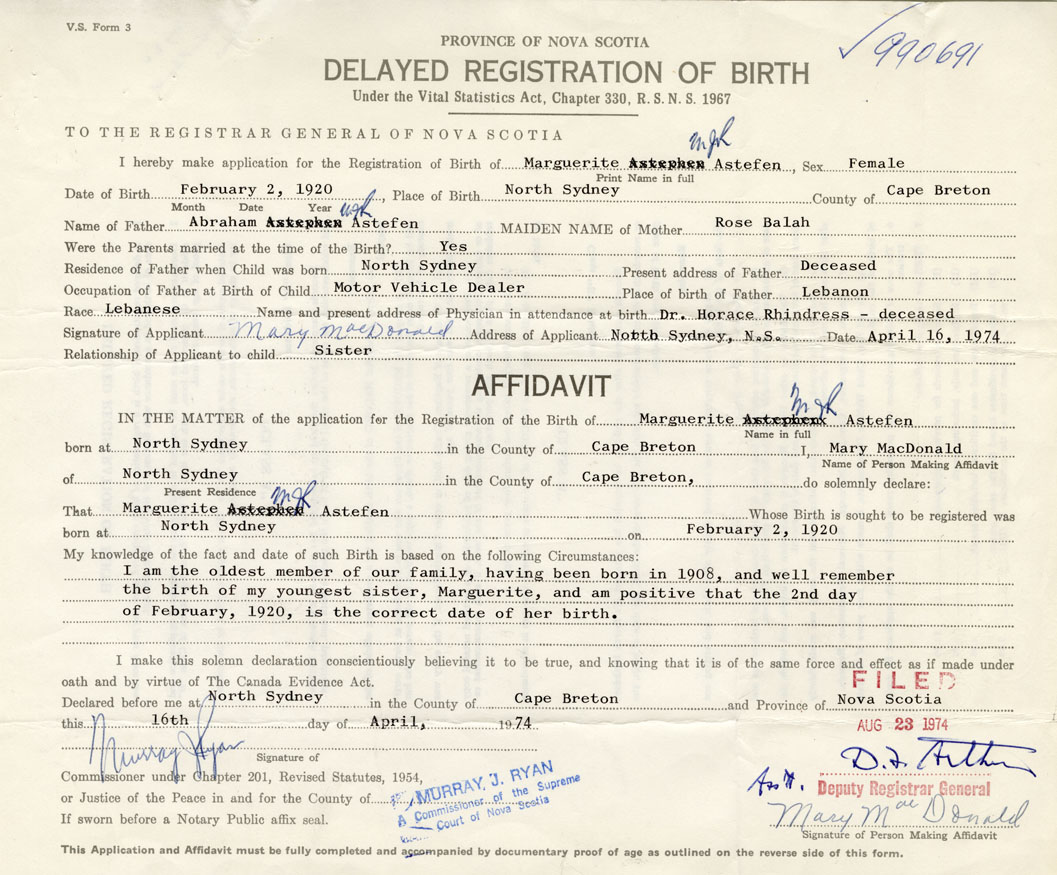 Signature of Applicant Mary MacDonald Address of Applicant North Sydney Date April 16, 1974