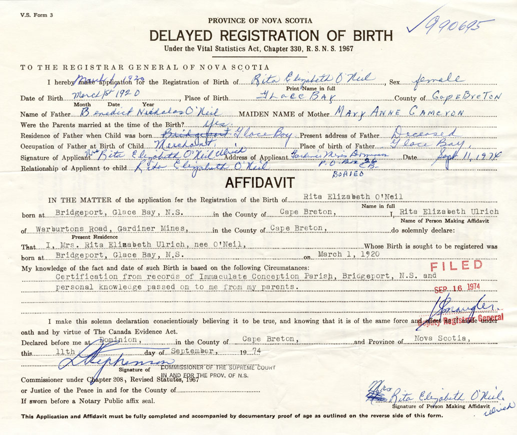 Signature of Applicant Rita Elizabeth O'Neil Ulrich Address of Applicant Dominion Date September 11, 1974